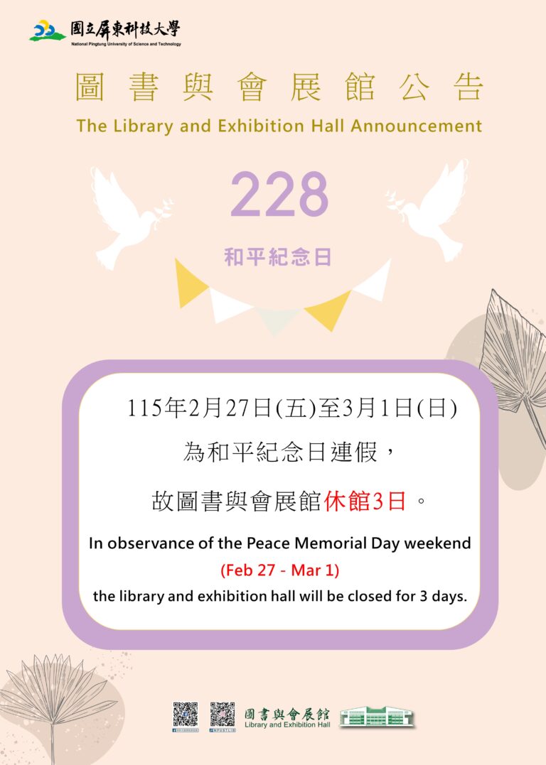 【公告】115年2月27日(五)至3月1日(日)為和平紀念日連假,故圖書與會展館休館3日。