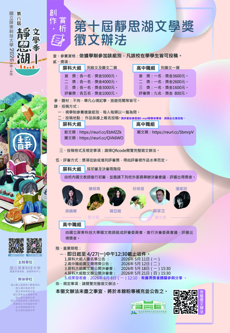 最新消息[會展活動組] - 【靜思湖文學季】屏科大「2026年靜思湖文學獎」開始投稿囉!