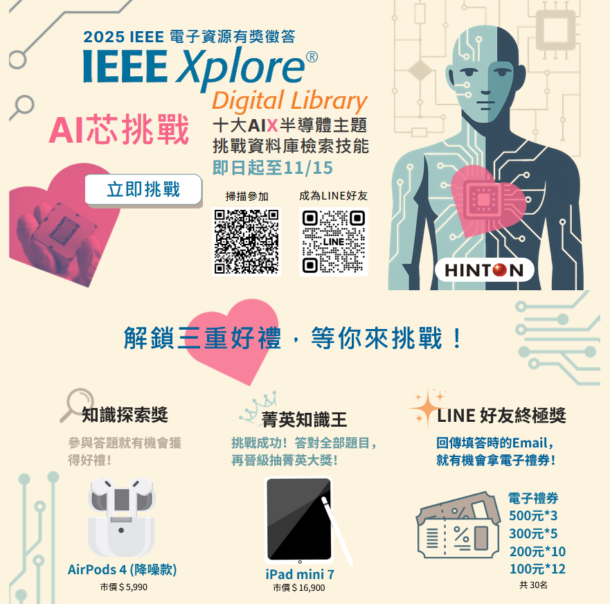 為促進全台大專校院師生對 IEEE XPLORE 數位資源之熟悉與應用,IEEE 即日起至 2025/11/15 舉辦「IEEE Xplore 有獎徵答:AI芯挑戰」活動,誠摯邀請貴館協助推廣,鼓勵師生踴躍參與。
