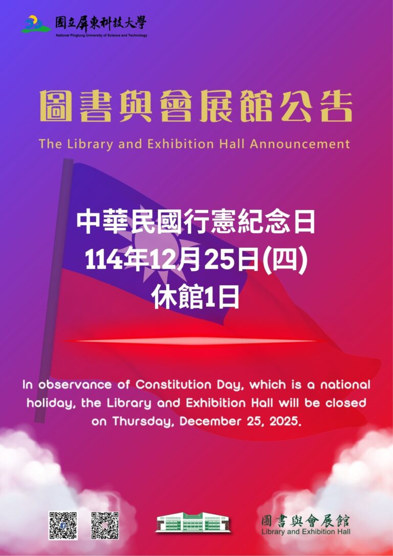 行憲紀念日適逢國定假日,本館於114年12月25日(四),休館1天。