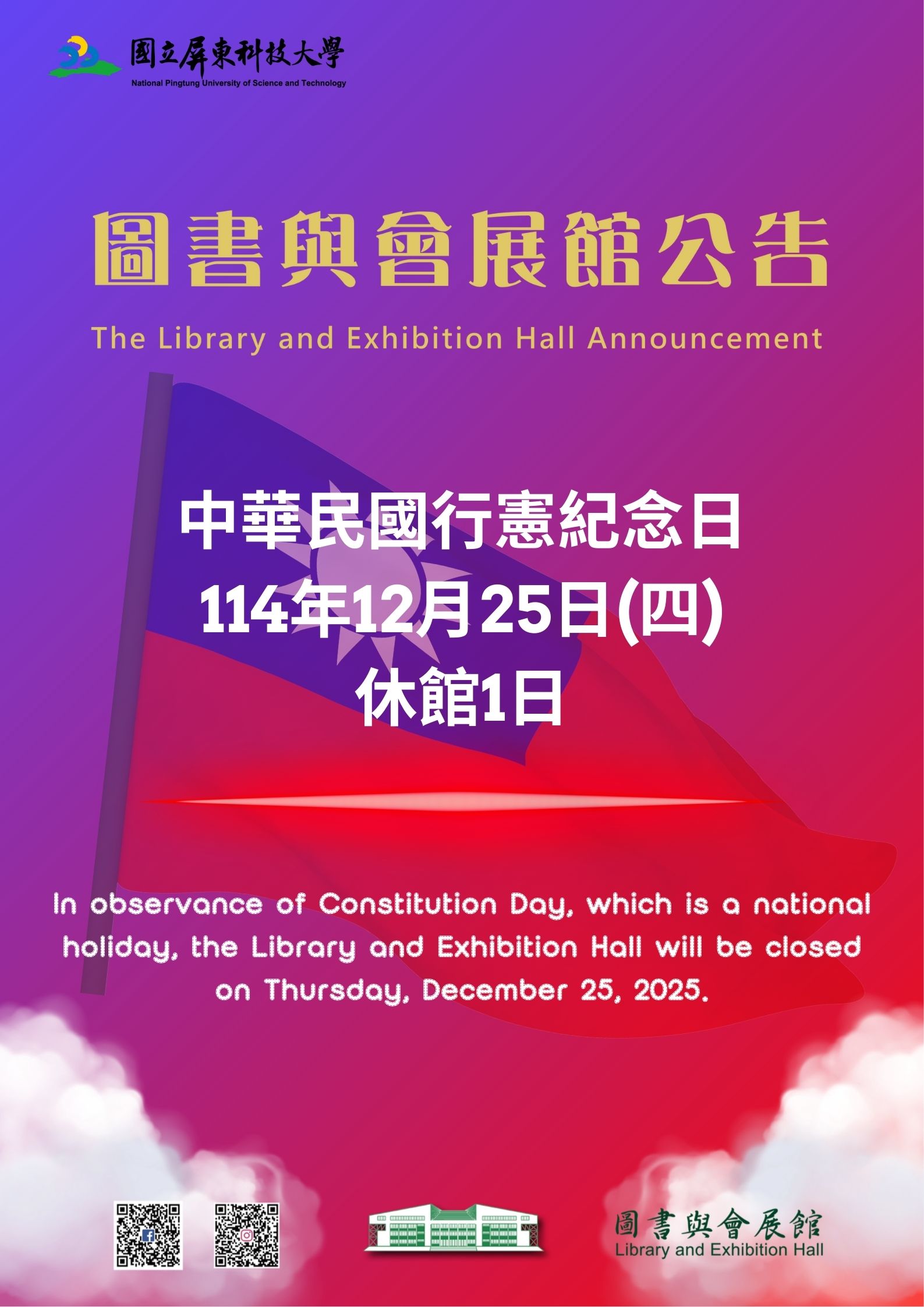 行憲紀念日適逢國定假日,本館於114年12月25日(四),休館1天。