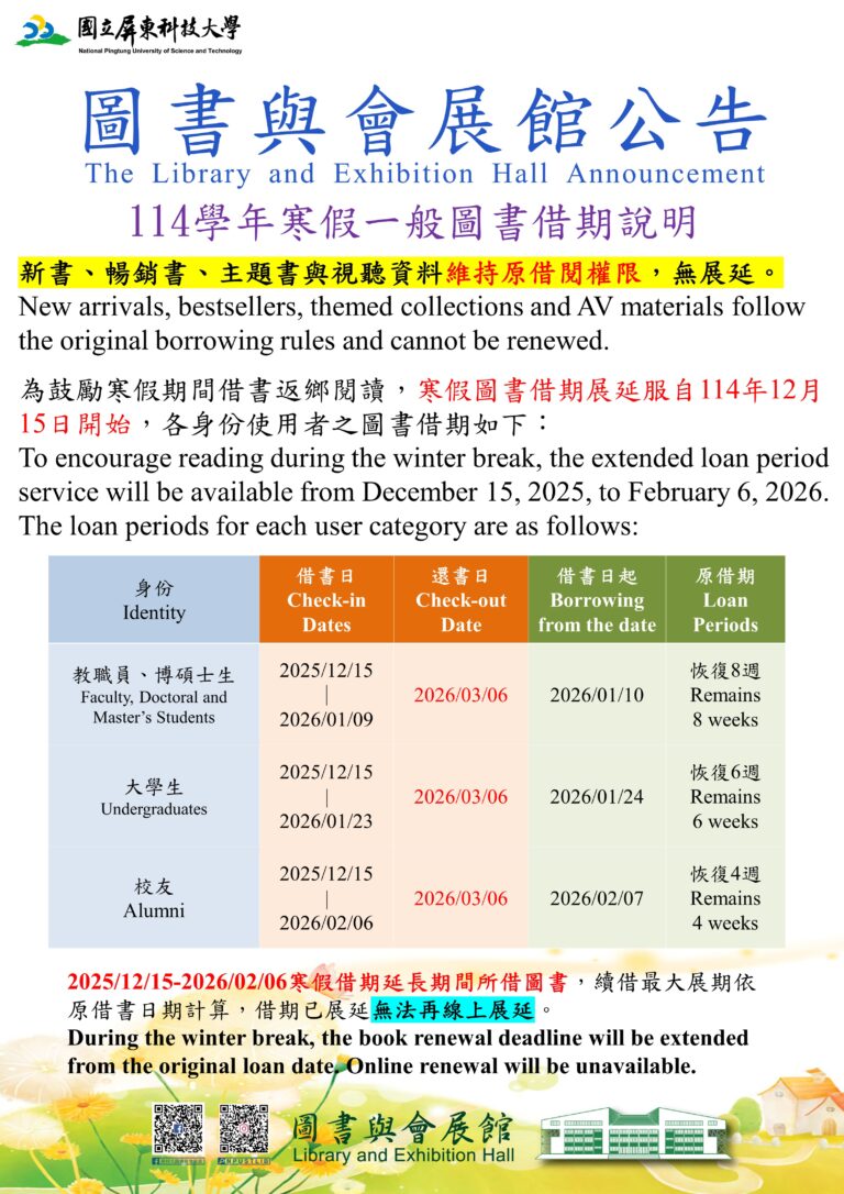 1. 2025/12/15–2026/02/06 寒假借期延長期間所借圖書,續借最大展期依原借書日期計算,借期已展延無法再線上展延。