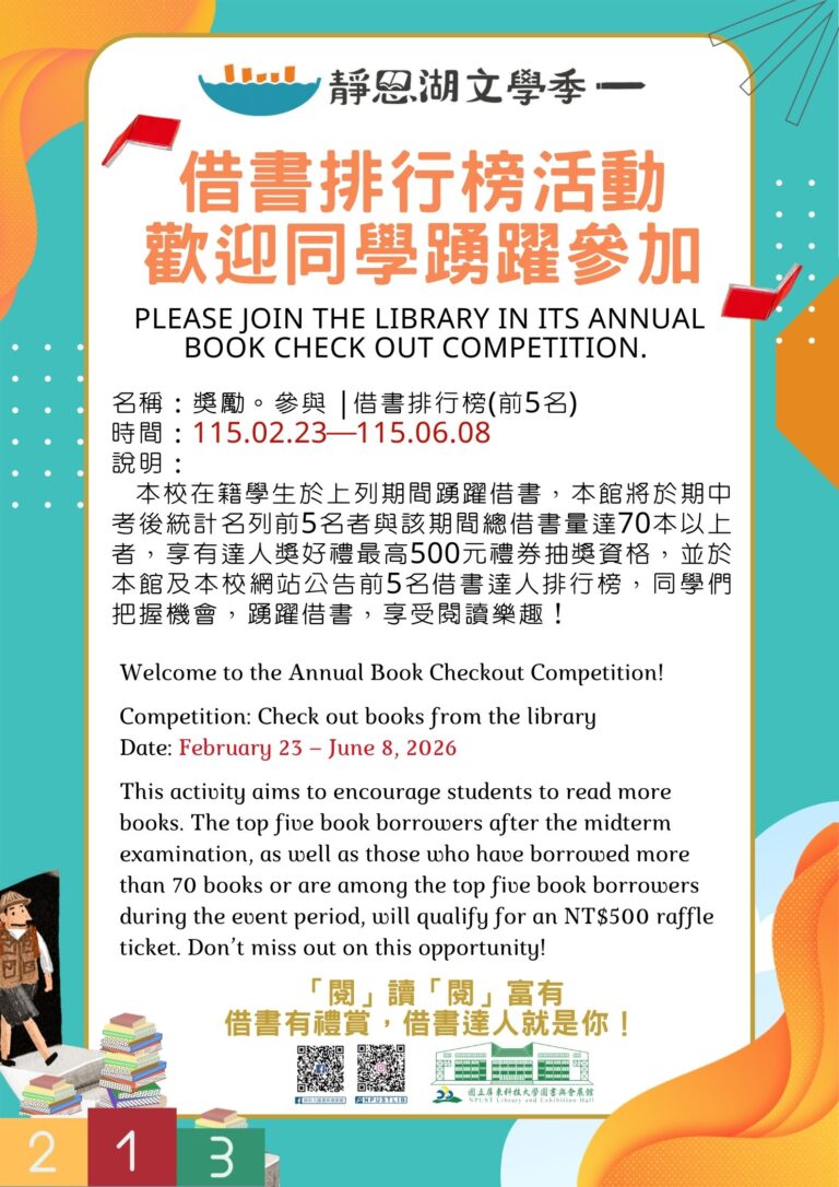 (1)115.04.24前公告借書達人排行榜:115.02.23-115.04.17 總借書量前5名者,可獲得1張摸彩券(有機會抽中500元禮券悠~)。
