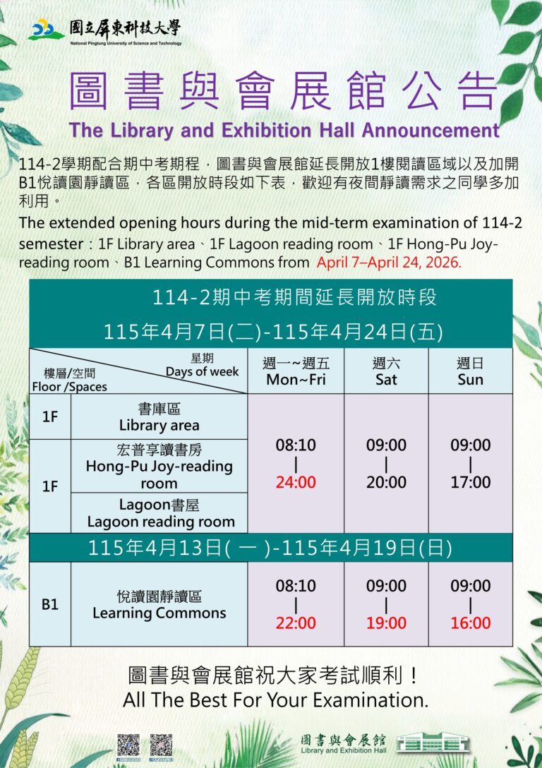 114-2學期配合期中考期程,圖書與會展館延長開放1樓閱讀區域以及加開B1悅讀園靜讀區,各區開放時段如下表,歡迎有夜間靜讀需求之同學多加利用。