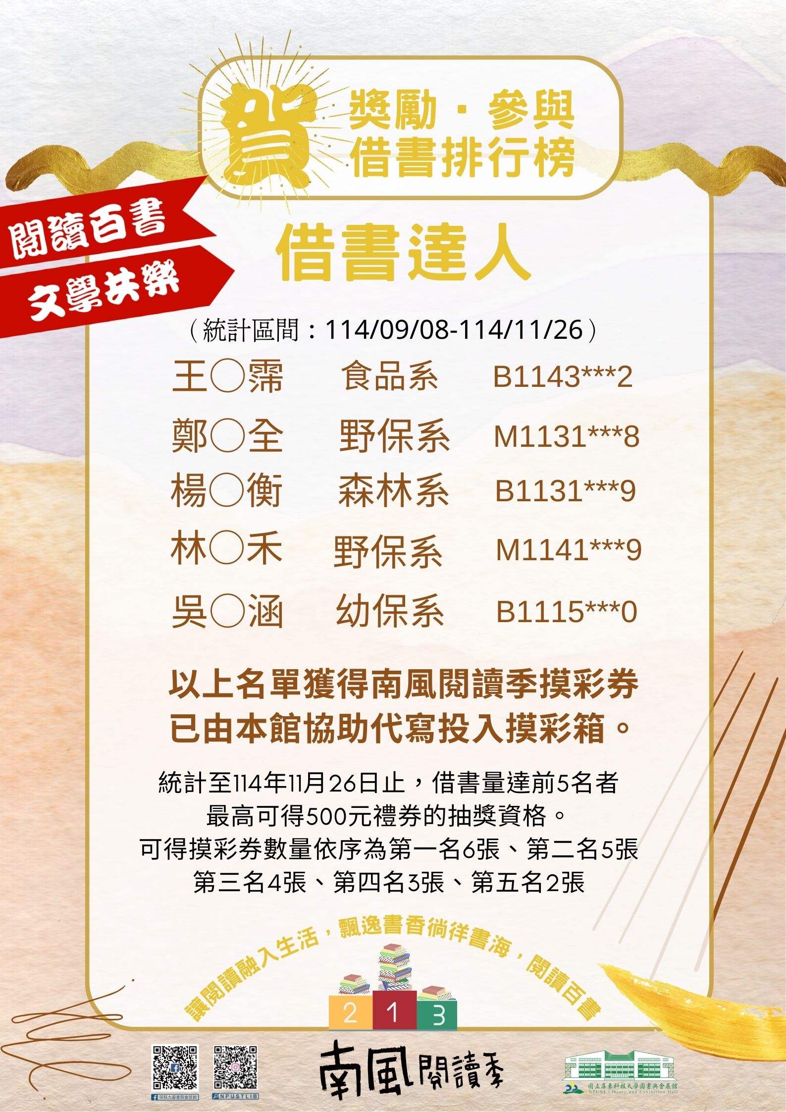 一、活動中(開學至114年10月27日止)借書量前5名者,可獲得1張摸彩券,由本館代填投入摸彩箱。