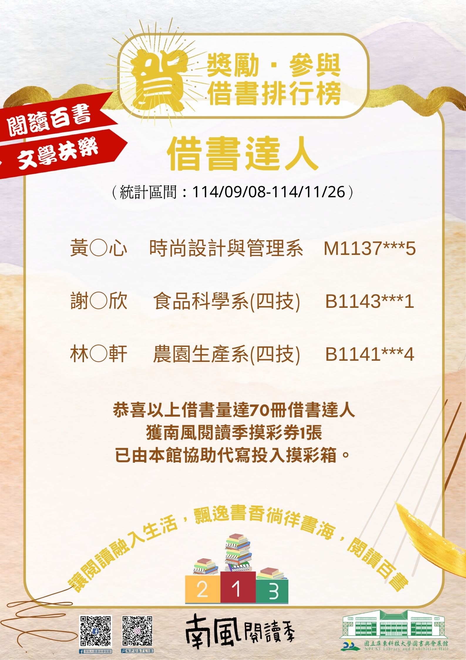 - 活動名稱:第八屆南風閱讀季獎勵。參與「借書排行榜」